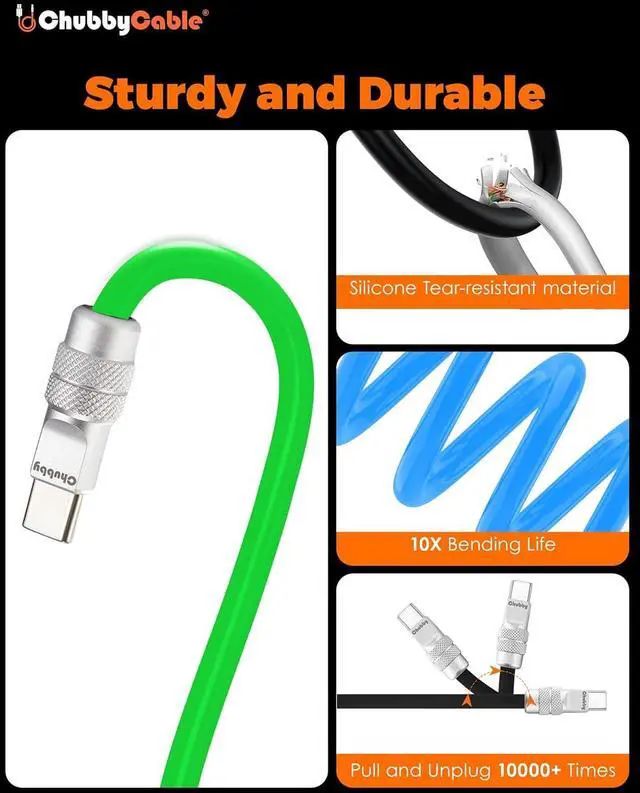 Built to Last Durable & Reliable: Made with premium silicone and an anti-corrosion zinc-aluminum alloy shell, this USB C cable resists dust, water splashes, wear, and daily damage. The thick 6mm design provides extra toughness, while a UV coating keeps it looking new. Tested to endure over 40,000 bends, it delivers long-lasting, reliable performance even in challenging environments