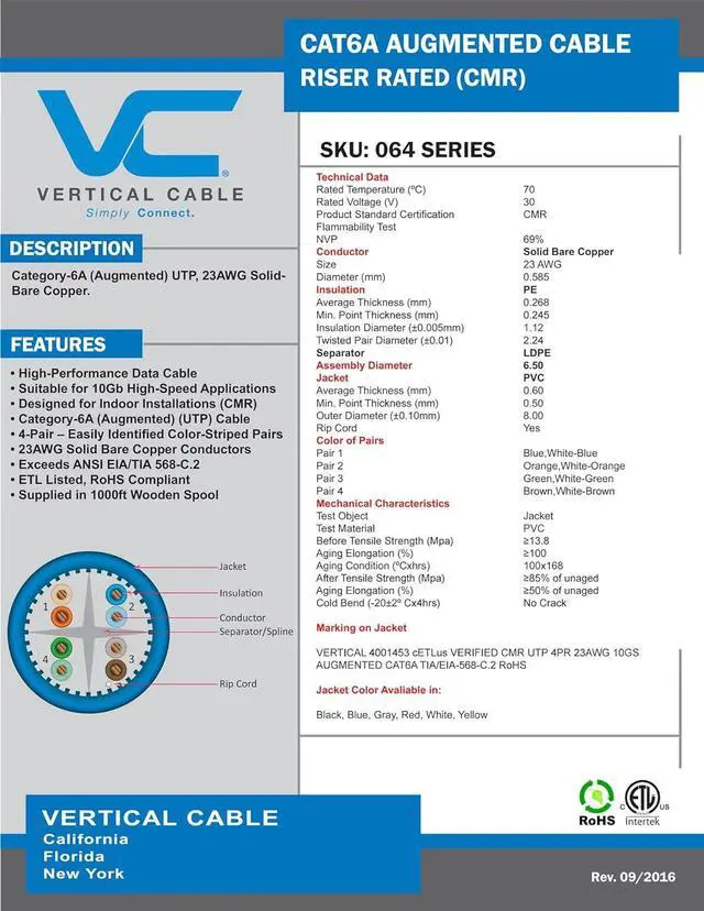 This Cat 6A unshielded twisted pair cable is a high-performance data communication cable suitable for 10Gbit high speed applications. It has excellent attenuation and crosstalk characteristics and exceeds TIA/EIA 568-C.2 specification. This ethernet cable is designed for indoor and riser network installations and is approved by ETL to be type CMR (riser rated communication cable). The wires are 23 awg in size and are made of solid bare copper conductors. All 4 pairs are easily identified by color stripes. The insulation material is PE and the jacket is made of PVC. This cat6A bulk cable is supplied in 1000 ft wooden spool and sequential length markings are printed on the jacket.