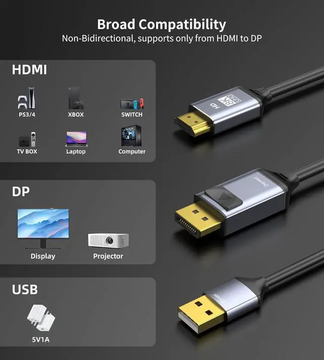 Important1) To get 8K resolutions, your monitor must also support 8K. 2) The USB plug is only for power supply, it cannot convert a USB port into a DP port. 3) This unidirectional HDMI to Displayport cable does not accept second conversion and the HDMI connector of this cable must be plugged directly into the HDMI port of the video source