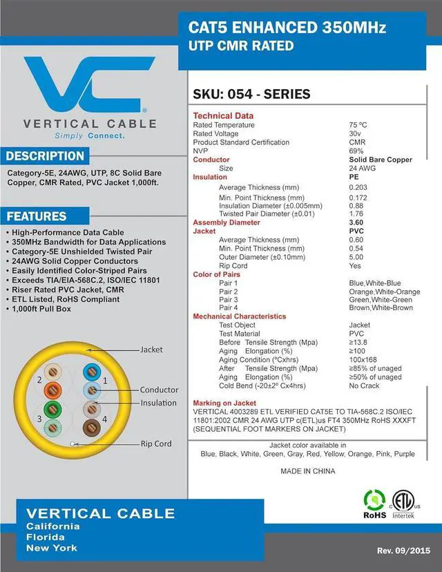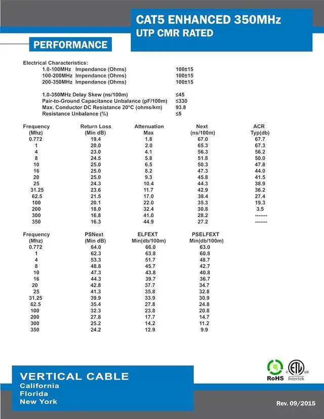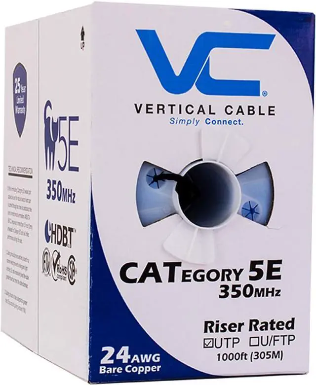 Cat 5e 350 mhz utp 1000 feet black Unshielded Twisted Pair (UTP) Cable - 350 MHz 24 awg wires made of solid bare copper conductors ETL type CMR for indoor and riser network installations Exceeds TIA/EIA 568-C.2 specifications