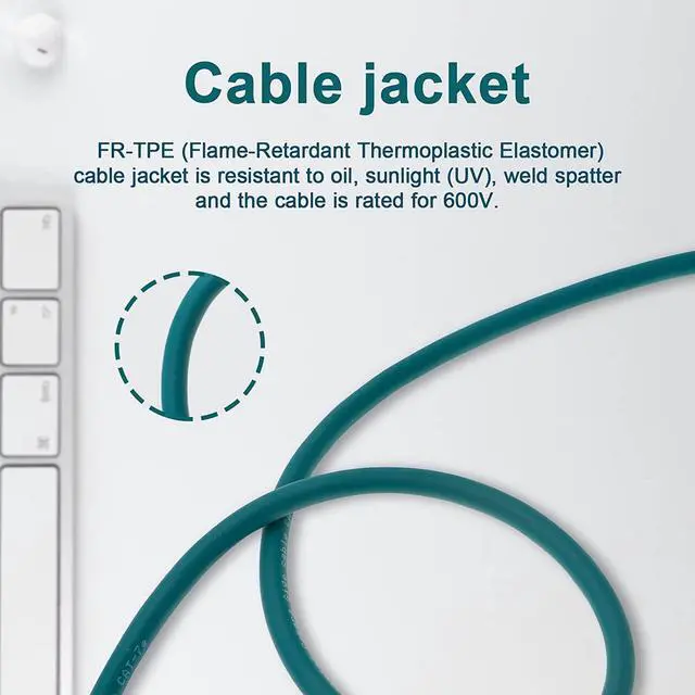 Cable jacket: FR-TPE (Flame-Retardant Thermoplastic Elastomer) cable jacket is resistant to oil, sunlight (UV), weld spatter and the cable is rated for 600V.