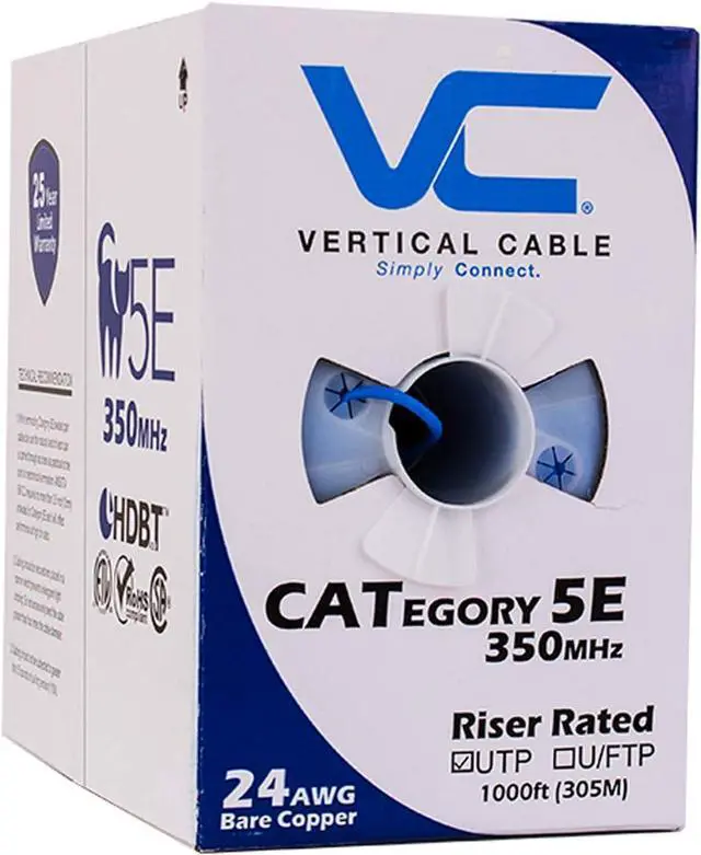 Cat 5e 350 mhz utp 1000 feet blue Unshielded Twisted Pair (UTP) Cable - 350 MHz 24 awg wires made of solid bare copper conductors ETL type CMR for indoor and riser network installations Exceeds TIA/EIA 568-C.2 specifications