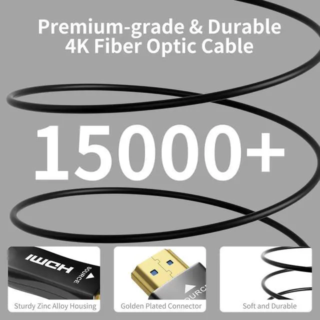 Premium Construction for Durability: Our fiber optic HDMI cable features 24K gold-plated plugs for enhanced durability and resistance to oxidation. The high-quality metal shell design improves heat dissipation, while the lightweight PVC material allows flexible bending of the HDMI cord angle for long-term durability. The HDMI cables enable uncompressed and lossless signal transmission over long distances thanks to the natural resistance of optical fiber to electromagnetic interference