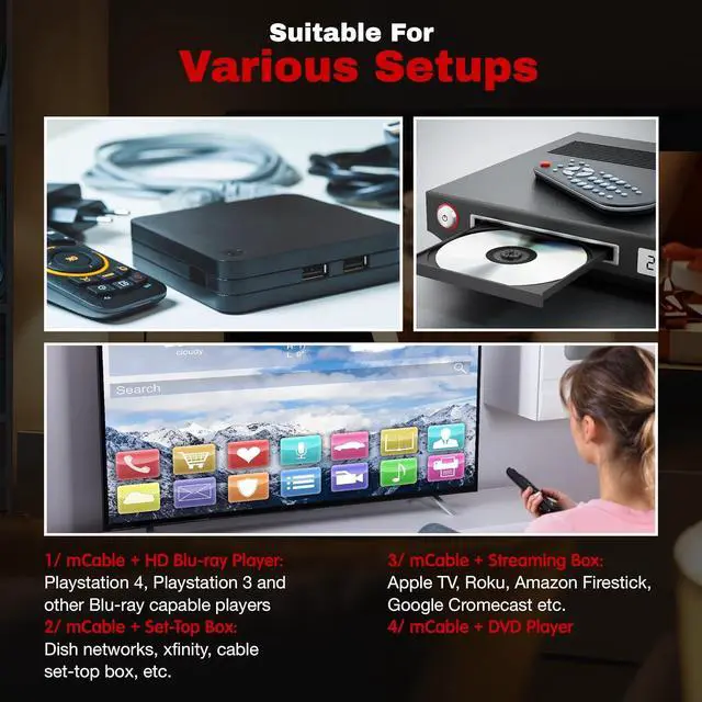 Simple plug-and-play set up for any home system. mCable is designed for multiple configurations and is easy to use with AV theatre systems, cable and satellite boxes, streaming services, home projectors, and Blu-ray and DVD disc players.