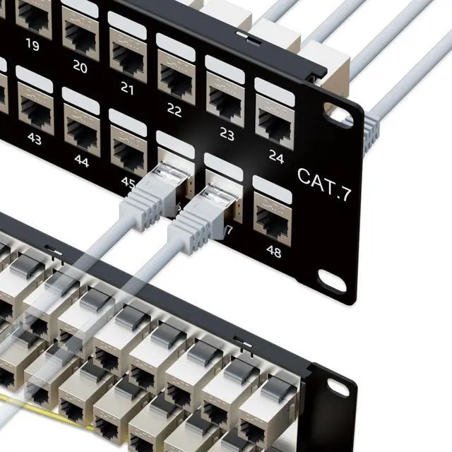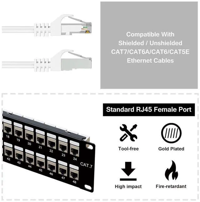 Toolless Termination - 48 Port Cat7 pass through Patch Panel came with couplers making it easier to connect the cables without any punching down. Simply plug the Cat7 cable into the 24 RJ45 coupler jacks on either side of the Ethernet panel.