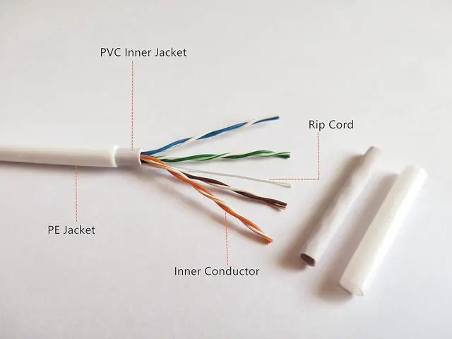 Durable and versatile: Our outdoor Cat5e Ethernet cable is double-jacketed with a weather-resistant PE outer layer and a tough PVC inner layer, making it suitable for direct burial in ground and walls. It features a copper-clad aluminum conductor for improved conductivity and a maximum bandwidth of 350 MHz.
