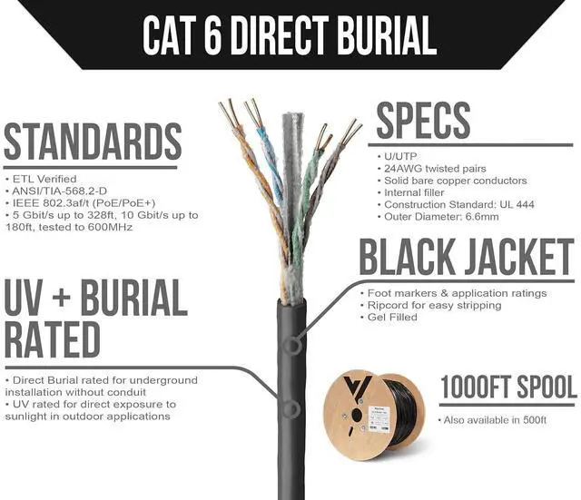 DIRECT BURIAL & UV RATED. Gel filled with a sunlight resistant outer jacket for outdoor and in-ground installation without conduit.