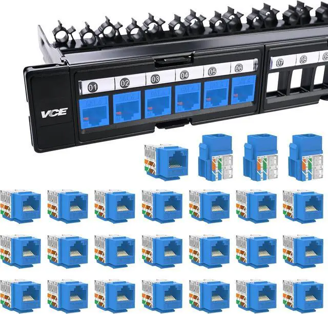 Package Content: 25 x Cat6 90-degree keystone jacks (blue) and 1 x CAT6 Patch Panel, 4 x spare ties, 4 pairs of screws.