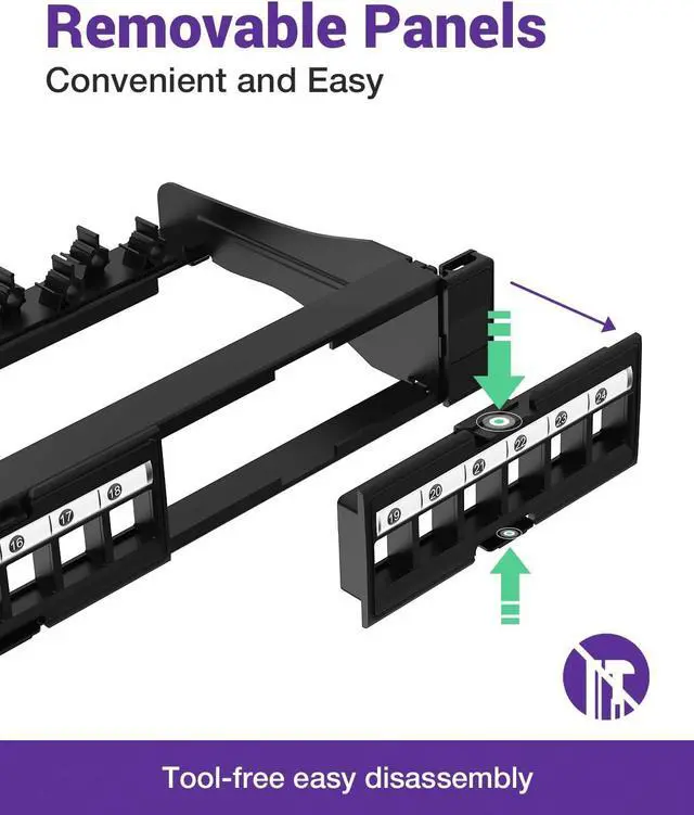 REMOVABLE PANELS: The removable panels design allows you to disassemble without tools easily, which is convenient for installation and post-maintenance. The 24 ports of the network patch panel are marked with removable labels on the front, which makes it convenient for you to quickly identify and replace the ports and greatly improves working efficiency.