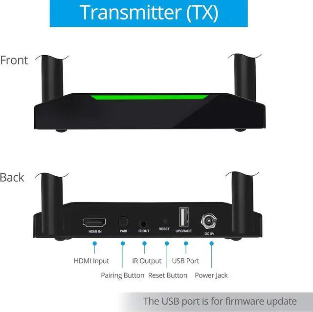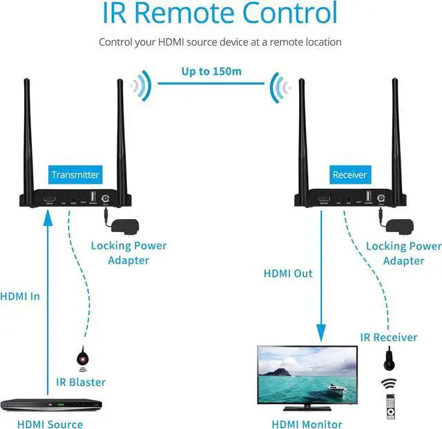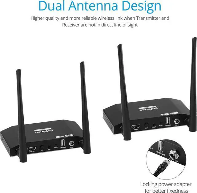 THE MOST CUT-EDGE WIRELESS HDMI EXTENSION TECHNOLOGY: our dual antenna wireless HDMI extender helps you transmit high-definition HDMI audio/video signal from your HDMI source to an HDTV, monitor or projector up to 500 feet (150 meters) away wirelessly. Unlike WHDI technology, the technology we use provides more stable and longer range signal transmission