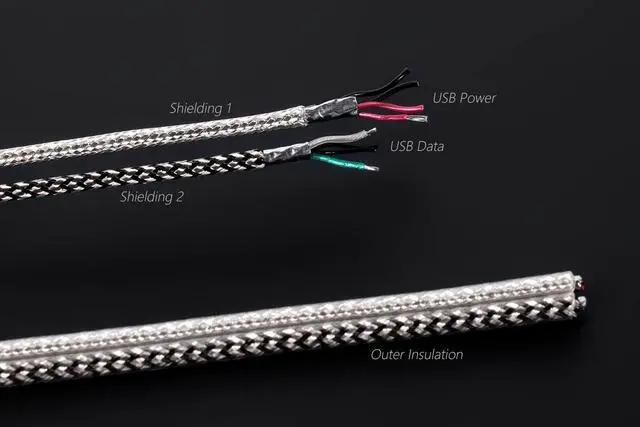 Double Shielded Data Cable StructureFor the Nyx series data cable, we developed a double-shielded parallel structure to shield current and data transmission respectively. They are also differentiable in appearance: the pore silver shielding outer layer is the power transmission part and the mixed silver and black shielding outer layer is the data transmission part. Signal transmission is more stable.
