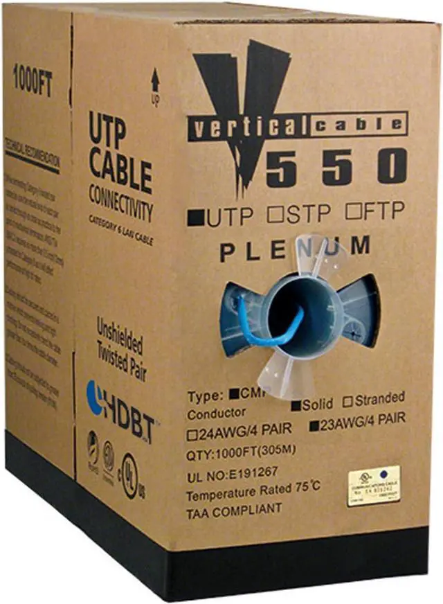 Cat 6 utp flame retardant plenum 1000 feet blue Outer Diameter 5.3 mm 23 awg wires made of solid bare copper conductors Type CMP for fire resistant plenum and roof network installations UL Listed