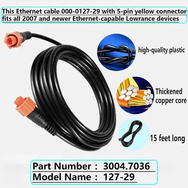 Ethernet Crossover Cable Suitable for Lowrance models with 5-pin yellow ether connector; for Broadband Radar, Broadband Sounder-1; GlobalMap 5200C, GlobalMap 5300C iGPS, GlobalMap 7200C, GlobalMap 7300C HD, GlobalMap 8200C, GlobalMap 8300C HD, GlobalMap 9200C, GlobalMap 9300C HD; LCX-112C, LCX-113C HD, LCX-27C, LCX-28C HD, LCX-37C, LCX-38C HD; LMS-520C, LMS-522C iGPS, LMS-525C DF, LMS-527C DF iGPS; Navico Expansion Port-1, StructureScan