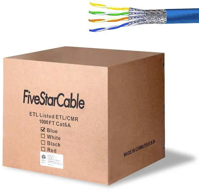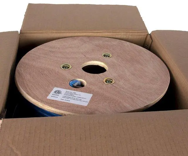 Cat6a 23AWG conductor CMR Riser rated for in-wall and conduit use, sweep frequency up to 500MHz; foot-marked cable in easy-to-use spool box. NO Tangle