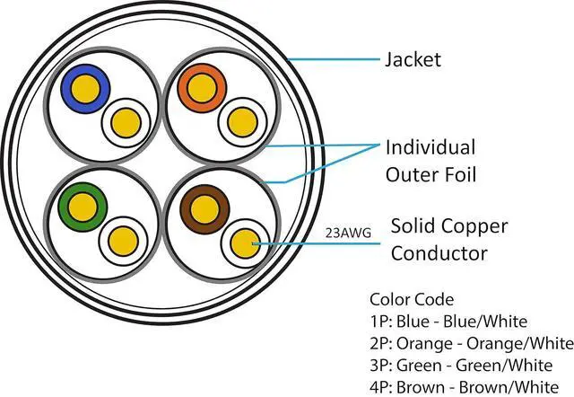 CAT6a Bare Copper Solid SSTP/SFTP outer screened foiled shield around all 4 copper pairs. Meets or exceeds Category 6A performance in compliance with the TIA/EIA 568-C.2 standard