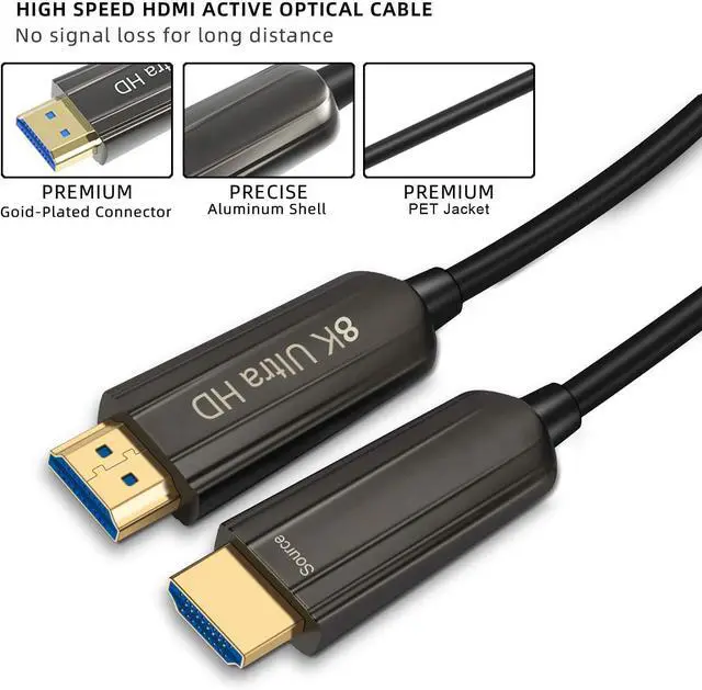 Experience superior visual quality with this advanced HDMI 2.1 fiber optic cable, engineered to deliver stunning 8K@60Hz and 4K@120Hz resolution. The cable utilizes active optical technology with a remarkable 48Gbps bandwidth, ensuring exceptional performance for gaming and entertainment. Its dynamic HDR and 12-bit color processing technology enhance every frame with improved depth, brightness, detail, and contrast. The cable supports a comprehensive range of features including HDR, DTS-HD, HDCP 2.2/2.3, Dolby Vision, IMAX ENHANCED, Dolby Atmos, and eARC. With a simple plug-and-play design, this 100ft cable seamlessly connects your HDMI devices, including gaming consoles (PS5, PS4, Xbox), computers, and A/V receivers to 8K HDTVs, monitors, or projectors. The cable comes with a 3-year quality assurance for peace of mind.