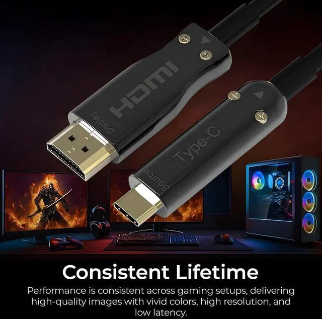 & : Engineered for stability, this cable uses advanced fiber optic tech to prevent connection drops. Ideal for professional use in gaming, streaming, or business delivering uninterrupted performance and ultra-low latency display.