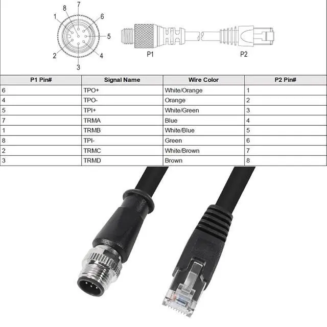 Connector A is RJ45, and connector B is M12 A code 8 pin male.Operating Temperature Range-40~+85.Cat6A 26 AWG with Black PUR JacketInsulation flame retardant.IP67,100% shielding.Cat6 26 AWG with Black Jacket.Cable lengths and connector types can be customized.