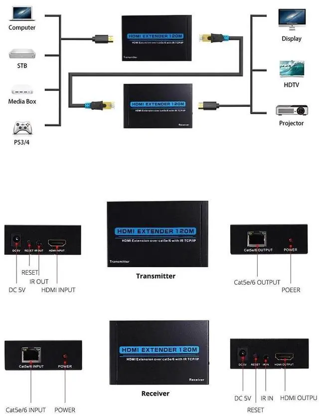 Model: HDMI extender 120m HDM to RJ45 Hd Resolution: 1920 * 1080p Product specification: 77 × 93 × 24mm Support system: common to all systems
