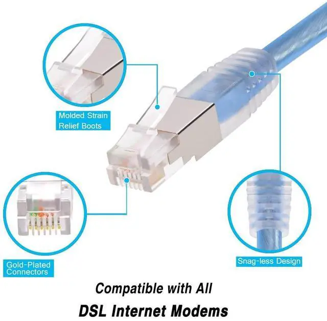 Compatible with all DSL Modems Ultra-Flexible see trough jacket Gold plated connectors to avoid corrosion and provide maximum connectivity Snaggles molded boot and effective strain relief Double shield (foil and braided shield) to reduce EMI