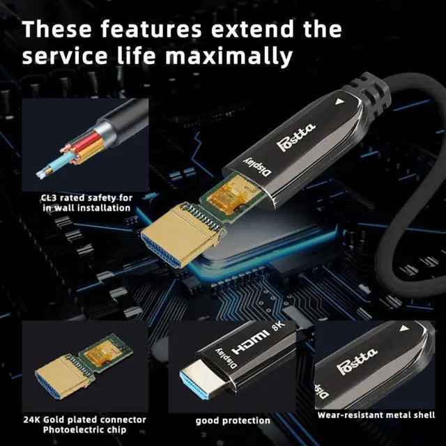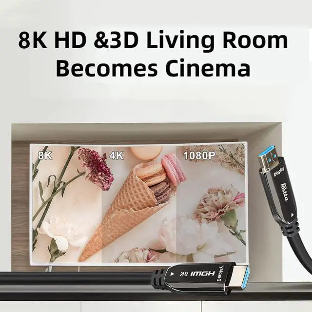 Fiber Optic HDMI Cable support 8K/60Hz,8bit for 4:4:4,12bit for 4:2:2,16bit for 4:2:0,HDCP2.2,3D,CEC,Ethernet Channel,Audio Return Channel and more,Fully Supports 48Gbps Bandwidth.