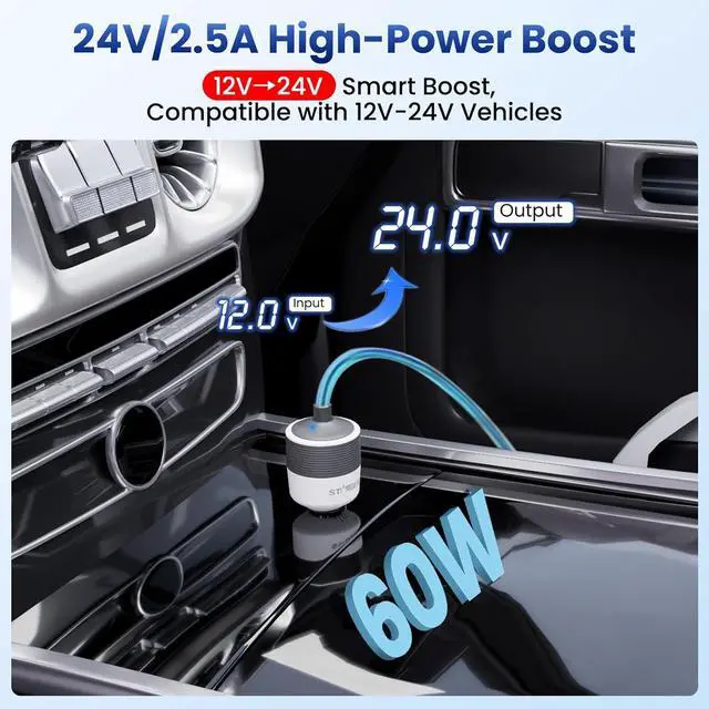 [ Instant 24V Boost Power for Starlink Mini ] Convert any 12V/24V cigarette lighter adapter to stable 24V/2.5A output with intelligent DC-DC technology. Enjoy true plug and play charging with auto-voltage stabilization, ensuring safe operation of your Starlink Mini even extreme conditions (-20°C to 60°C). Universal cigarette lighter plug for cars, trucks, RVs and boats