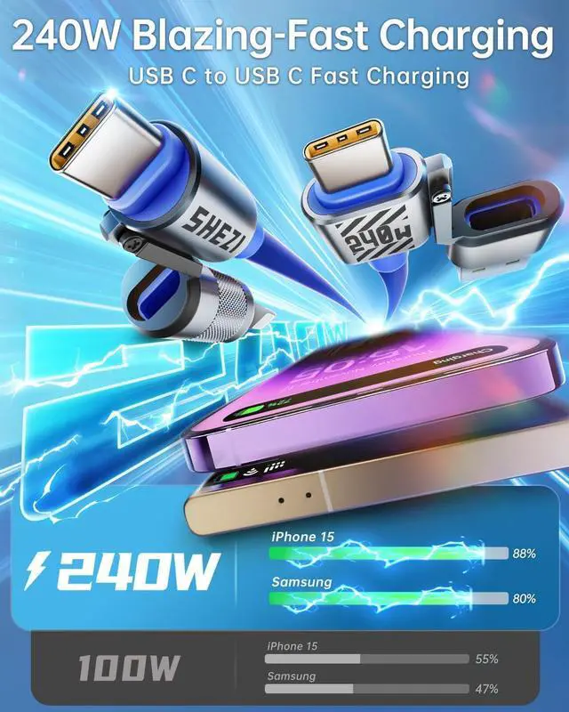 • [240W Fast Charging & Data Sync] This 240W USB-C to USB-C cable supports PD 3.0 fast charging, it can fast charge your Macbook Pro and iPhone 15/15 Plus/iPhone 15 Pro Max, giving you a quick and convenient way to charge your devices up to 80% in 30 minutes, and data transfer speeds up to 480Mbps (1200 songs synced per minute).