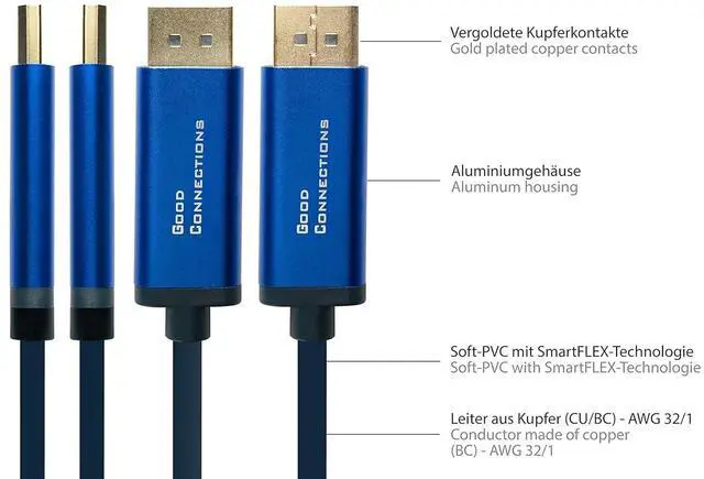 High-quality cable construction, aluminium housing, triple shielding and soft PVC cable sheath
