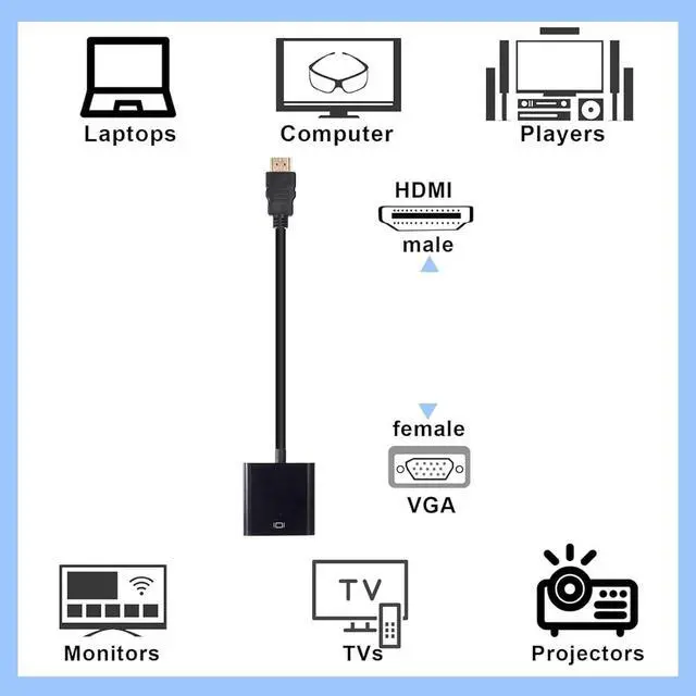 Efficient and Stability: our HDMI male to VGA female adapter converter compatible with HDMI video input format 480i/576i/480p/576p/720p/1080i/1080p/60HZ while the supports VGA output resolution 640 x 480, 800 x 600, 1024 x 768, 1280 x 720, 1280 x 768, 1280 x 800, 1280 x 1024, 1360 x 768, 1600 x 1200, 1920 x 1080; The picture effect may vary slightly depending on the device