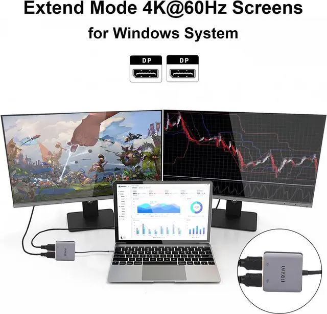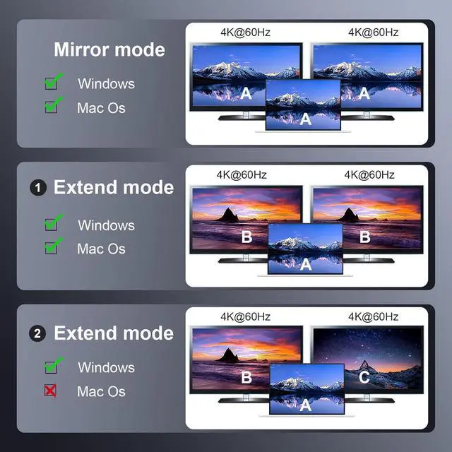Extended Mode and Mirror Mode: dual Display Port splitter 1 in 2 out supports both extended and mirror modes. It adds dual DisplayPort monitors to your DisplayPort desktop/laptop/graphics card as a DisplayPort splitter for dual DisplayPort monitors. Windows OS supports both MST(A+B+C) and SST(Mirror Mode A+A+A/A+B+B), while macOS only supports SST (Mirror Mode A+A+A/A+B+B). *Do not connect to other DP docks or hubs. *Most laptops and PCs with integrated graphics may only be able to mirror the screen (ABB/AAA).