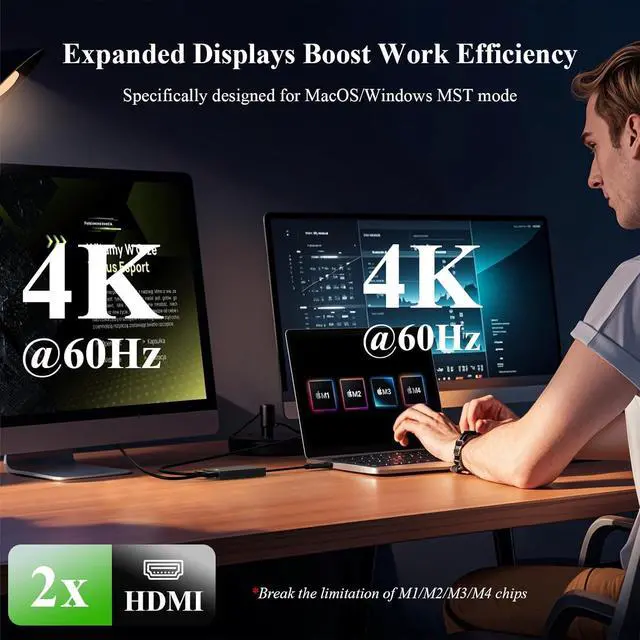 Dual 4K Display OutputThis USB 3.1 to dual HDMI adapter enables simultaneous dual 4K output via two HDMI ports, delivering ultra-high definition resolution (4096x2160@60Hz) through a single USB A / USB C 3.1 interface; Ideal for multitasking professionals, it ensures sharp and clear visuals for video editing, data analysis, and cross-platform workflows