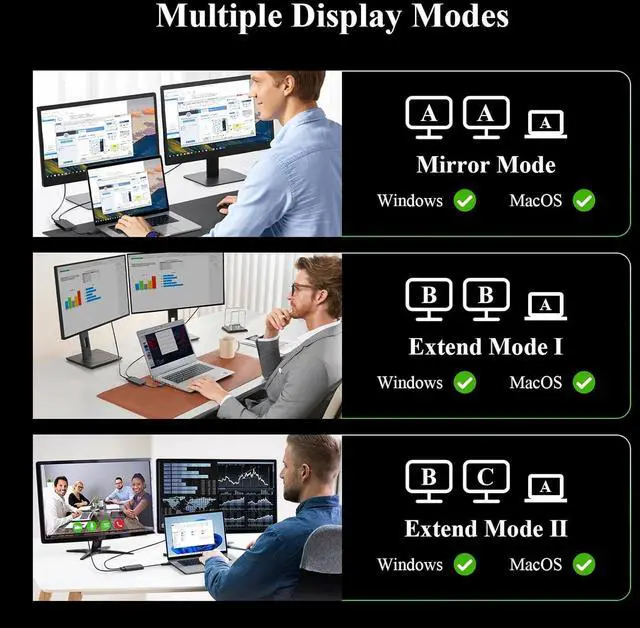 Multiple Display ModesMinthouz USB C to dual HDMI Adapter supports 2 extension modes (Mirror/Extend) and 4 display modes (AAA/ABB/ABA/ABC); Enables extending up to six monitors for Windows or four monitors for Mac with different content via multiple adapters