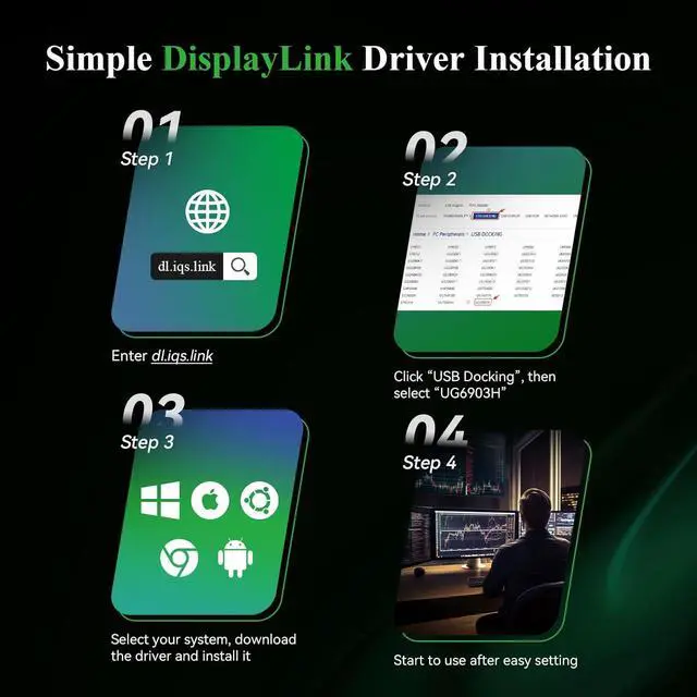 Wide CompatibilityThe USB to HDMI adapter supports Windows 7/8/8.1/10/11, MacOS 10.14-15.x or later, Chrome OS, Android, Ubuntu, and HarmonyOS; Not compatible with Linux, Unix, iPadOS & iOS; Note: Driver installation required (not plug-and-play), visit 'dl.iqs.link' to download the latest driver