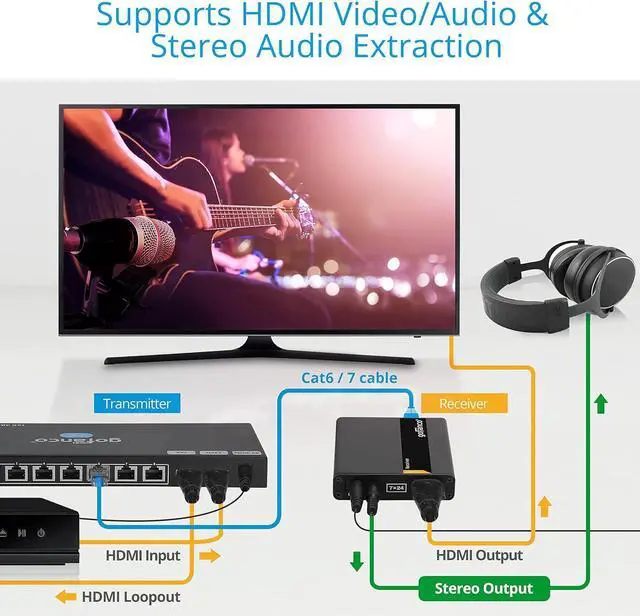 1x8 HDMI EXTENDER/ SPLITTER Extend and split one HDMI source to two CAT6/7 & one HDMI outputs simultaneously at near zero latency. Perfect for business, classrooms, or digital signage