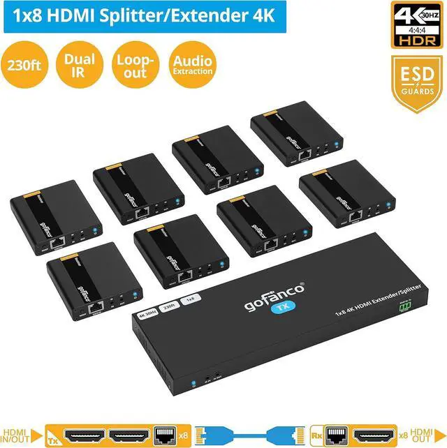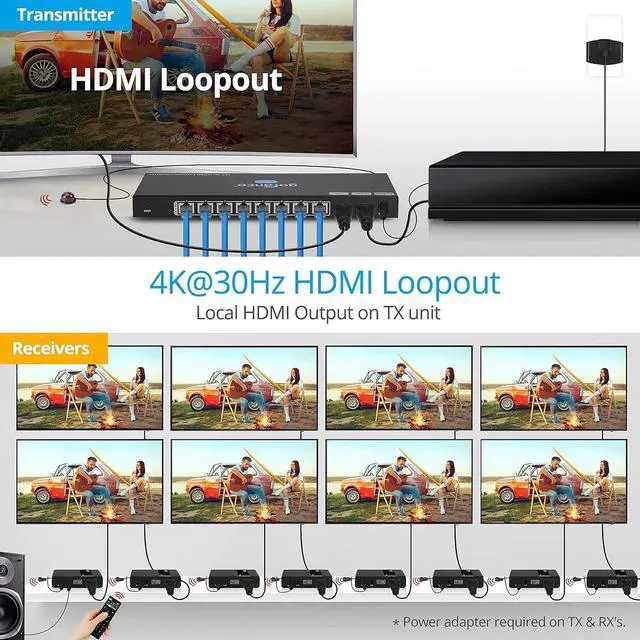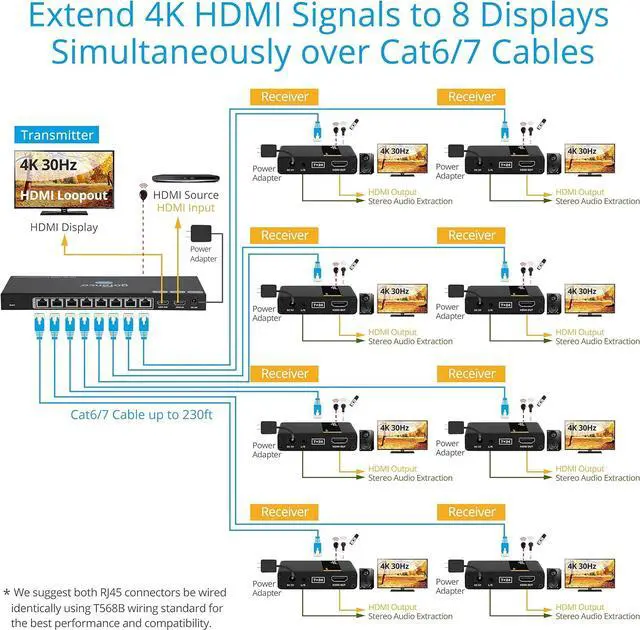 RESOLUTION & TRANSMISSION Supports up to 4K @30Hz, HDCP 1.4. Extends up to 131ft (40m) at 4K/30Hz, and 1080p at 230ft (70m) over CAT6/7, delivering smooth, reliable video for every screen