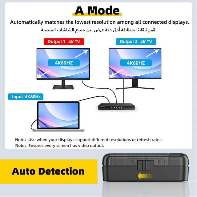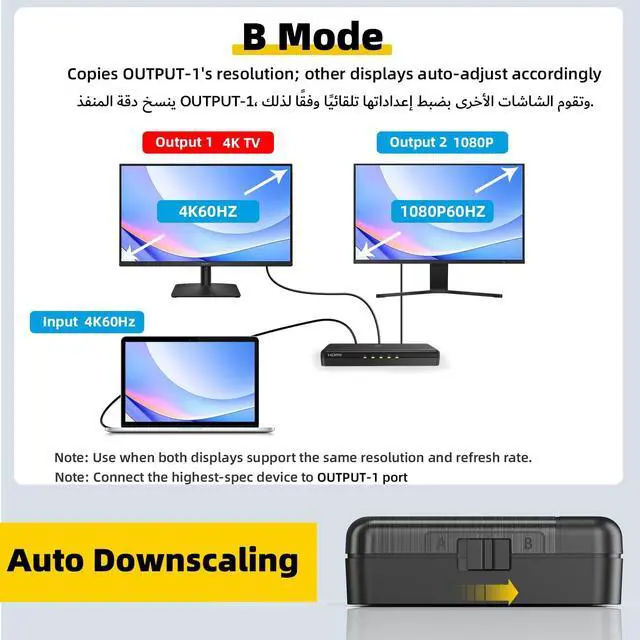 Auto Downscaling Feature: Includes EDID management and auto downscaling; supports simultaneous 4K and 1080p displays, allowing each monitor to display its highest supported resolution (not compatible with 720p or 480p downscaling).