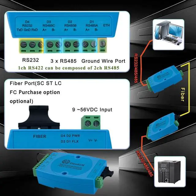 The RS232 RS485 RS422 to fiber converter support 9~56V DC input; Single fiber or double fiber ST FC SC purchase option optional