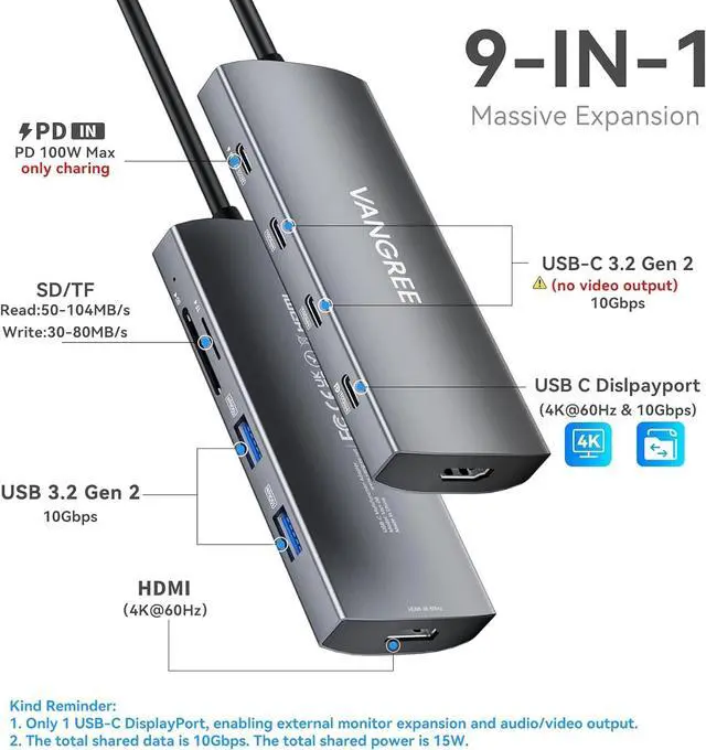 9-IN-1 USB C VIDEO OUTPUT HUB: This USB C Hub expands one type-c port to 2*USB-C 3.2 10Gbps ports, 2*USB-A 3.2 10Gbps ports, USB-C DisplayPort (4K@60Hz & 10Gbps), 100W power delivery port, 4K@60Hz HDMI port, SD/TF card reader.