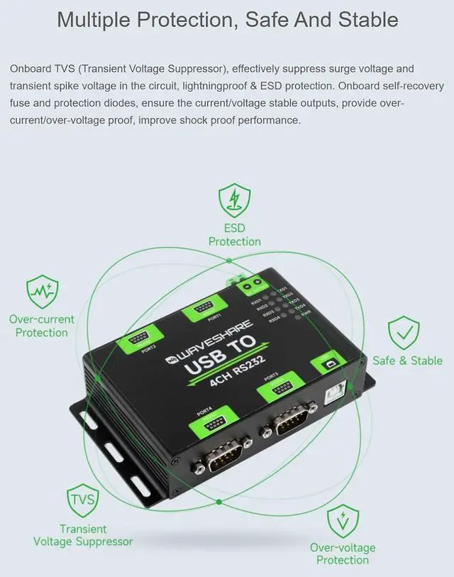 Onboard TVS (Transient Voltage Suppressor), effectively suppress surge voltage and transient spike voltage in the circuit, lightningproof & ESD protection