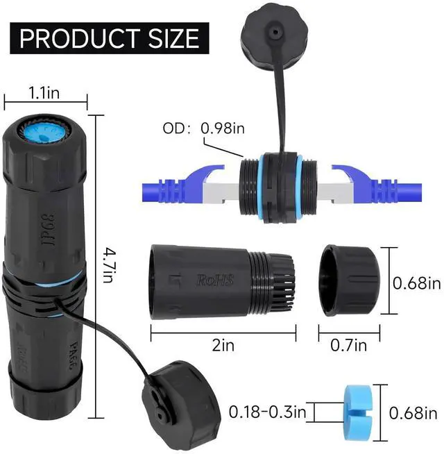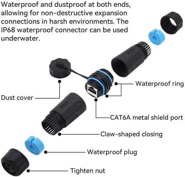 IP67 Class CAT6A Waterproof Connector, dust-proof can be used in harsh industrial or outdoor environments, a perfect solution to protect your Ethernet cable.