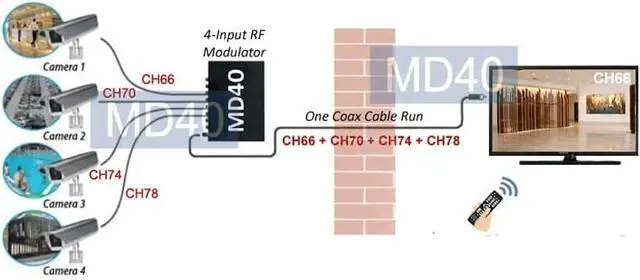 Srong 100db signal output sufficient for long cable runs up to 1200 meters. Multiple of these 4-input coax video modulator units can be cascaded together to distribute more video feeds to more TVs in the same coax cable run.