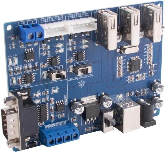 SuperHub can realize USB port expansion, USB to TTL, 232, 485 serial ports and 5V/3.3V power output, which integrates multiple functions to facilitate the development of engineers. This product can realize 3 USB2.0 interface expansion, 2 TTL serial ports (5V/3.3V level switchable), 1 RS-232 interface and 1 RS-485 interface, and provide 1.5A power output (5V /3.3V two voltages, with external power supply.)