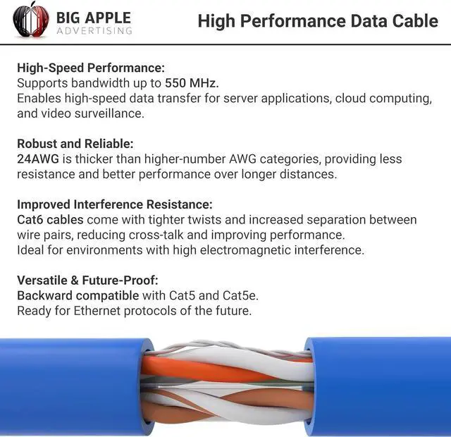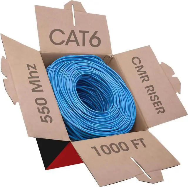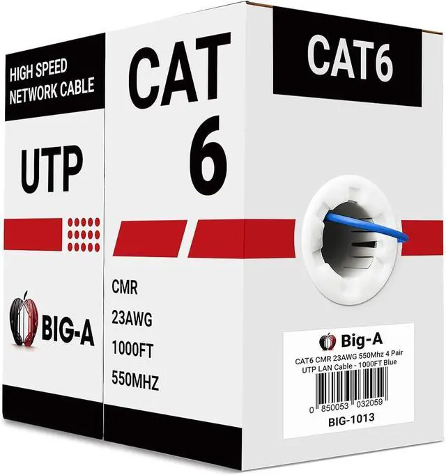 Conductor TypeCopper Clad Aluminum (CCA) for superior performanceCompatible DevicesRouters, VoIP, IP Cameras, Consoles, PoEBandwidth & SpeedUp to 10 Gbps with 550 MHz frequencyCable DurabilityPVC jacket, high stress endurance, long lifespanLength & Packaging1000ft in EZ-pull box with foot-marked lengthsCable CategoryCAT6, suited for 100/1000BASE-T/10 Gigabit networksCable Gauge23 AWG Premium Networking with Big-A Cat5e Cable