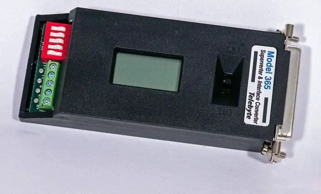 The Model 365 multimode interface converter allows operation in compliance with RS-485 or RS-422 equipment, and RS-232. When operating as RS-485 the Model 365 has an "intelligent" mode which provides control of the RS-485 line. Operating as an RS-232 to RS-422 interface converter, the Model 365 converts full duplex data, TD and RD, between RS-232 and RS-422. As an RS-232 to RS-485 converter the Model 365 can be configured as a 2 wire or a 4 wire converter. For RS-485 half duplex protocol, the Model 365 can be configured to control its data flow in one of two ways. The first is via the use of RTS, pin 4, of the RS-232 port. The second is to turn it on when TD data is applied to the RS-232 port. The Model 365 includes Telebyte's unique DataSpy LCD display, which provides the user with status information regarding the operation of the device. The LCD is useful during the installation and checkout and whenever there are suspected problems. The graphic display presents the user with live status of the transmit and receive data signals, TD and RD, and control signals, CTS, RTS, DSR, DCD, and DTR.