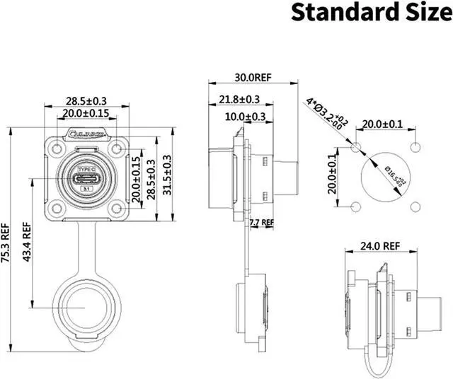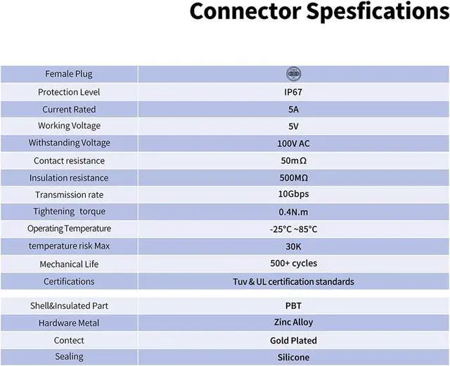 Waterproof USB C Connector Ensures durability in humid or wet conditions.