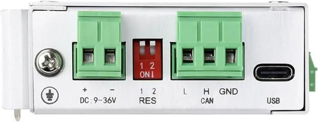 Built with metal housing, accepts 9-36V input, featuring configurable arbitration/data rates up to 1Mbps/5Mbps via PC software