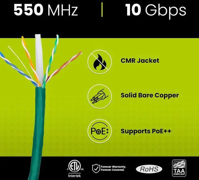 [High Performance Network Cable] This riser rated cat 6 lan cable is 23 AWG with 4 pairs (8 conductors). Suitable for 1 and 5 Gigabit speed up to 328 feet and 10 Gigabit speed up to 165ft depending on the installation environment. Bandwidth tested up to 550 MHz. Supports Power over Ethernet: PoE/PoE+/PoE++ (IEEE 802.3af/at/bt) 4PPoE up to 100W.