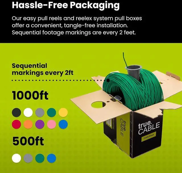 [Hassle Free Packaging] 1000 feet (305 meters) comes conveniently pre-spooled in a tangle free, easy pull box so you dont have to worry about getting behind on your next job.