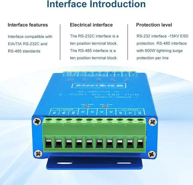 **Durable and Compatible Design**: The module includes an external switch power supply for reliable outdoor engineering applications. It is compatible with EIA/TIA RS-232C and RS-485 standards. The RS-232C interface is a ten-position terminal block with 15KV ESD protection, while the RS-485 interface offers 600W lightning surge protection per line. The module is designed to operate in harsh environments with temperatures ranging from -40°C to 85°C and relative humidity between 5% and 95%.