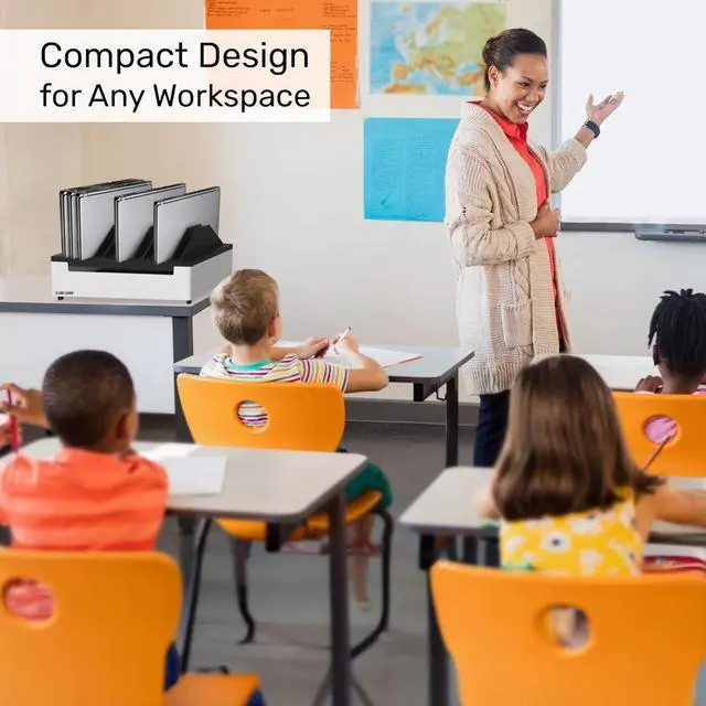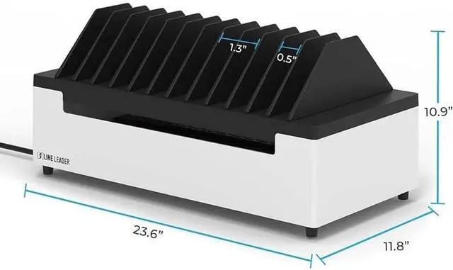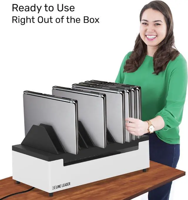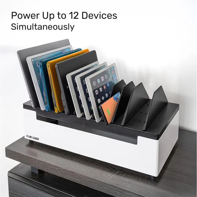 Next page Keep devices charged and organized with the Line Leader open charging station by Stand Steady. Adjustable dividers paired with a hidden surge-protected power strip safely charge up to 12 devices at once. With its compact desktop design, this charger station frees up floor space while keeping laptops, Chromebooks, and tablets in reach.